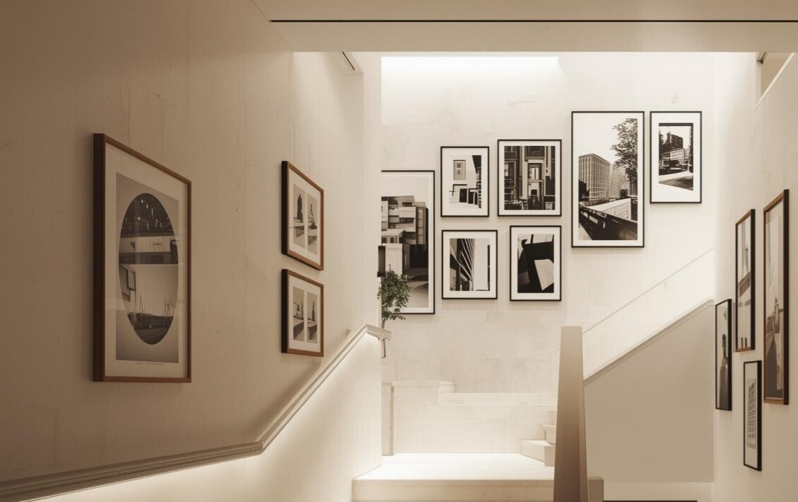 - Définir un fil conducteur : pour une galerie de photos ou de tableaux, optez pour des cadres similaires, une palette de couleurs cohérente ou un style commun (par exemple uniquement des photos en noir et blanc). Ce fil conducteur permet d’unifier l’ensemble et d’éviter l’impression de désordre.